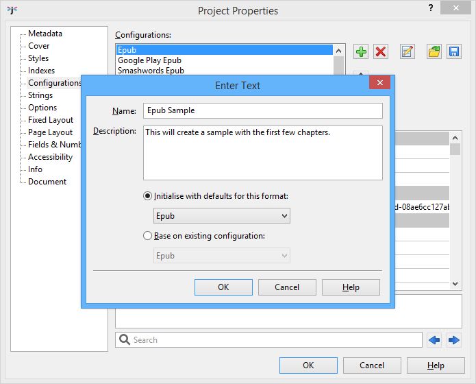 Let’s say you wanted to be able to create a sample book in Epub format. Create a new configuration called ‘Epub Sample’ using the ‘+’ button on the Configurations panel in Project Properties. To get there, press Edit next to the configuration drop-down in the Jutoh Control Panel (bottom left of the Jutoh window). Type ‘Epub Sample’ for the new configuration name, and select a configuration to base this one on, or just press OK to be prompted for a format which will be used to create appropriate configuration defaults.