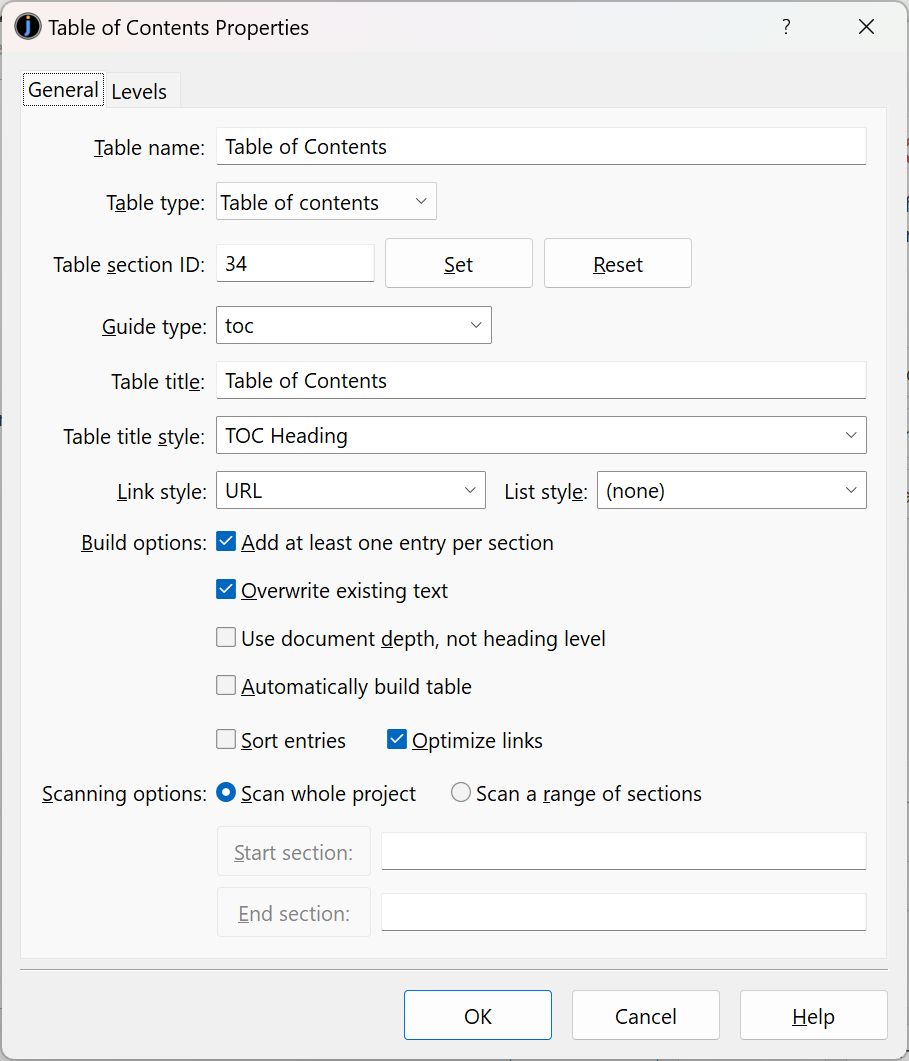 To edit the detailed properties of your table of contents when you’re not using the table of contents wizard, show the Project Properties dialog, click on Indexes, then click on Contents. Now click on Edit