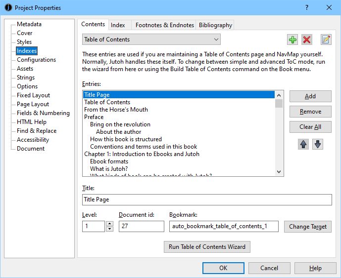 Jutoh supports an additional, advanced method of building a table of contents. In this mode, you maintain an explicit list of contents entries, with help from Jutoh. The entries appear in the Contents page of the Project Properties dialog (under Indexes/Contents), and are also editable in the Table of Contents Wizard. Use this wizard (with the command Format | Book | Build Table of Contents) to switch to advanced mode and specify how contents entries will be gathered from headings in your documents.