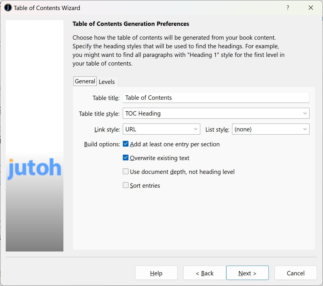 Note that to make best use of the advanced table of contents facility, you need to use consistent heading styles in your document, so Jutoh can work out the heading levels (in the structure implicit in your document) and add bookmarks to them. For example, you might use ‘Heading 1’, ‘Heading 2’, ‘Heading 3’ and so on.
